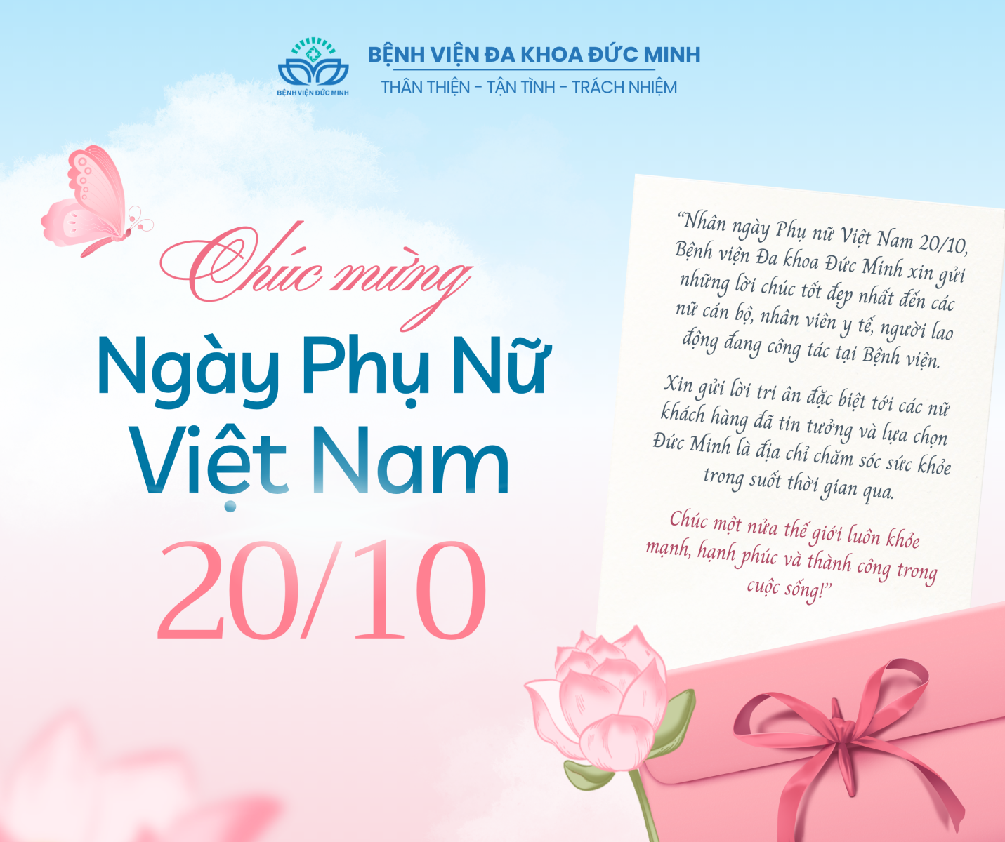 🌸💐 CHÚC MỪNG NGÀY PHỤ NỮ VIỆT NAM 20/10 💐🌸Nhân Ngày Phụ nữ Việt Nam 20/10, Bệnh viện Đa khoa Đức Minh xin gửi đến toàn thể các nữ cán bộ, nhân viên y tế, người lao động của bệnh viện, cùng các Bà, các Mẹ, các Cô, các Chị em những lời chúc tốt đẹp nhất! 💖