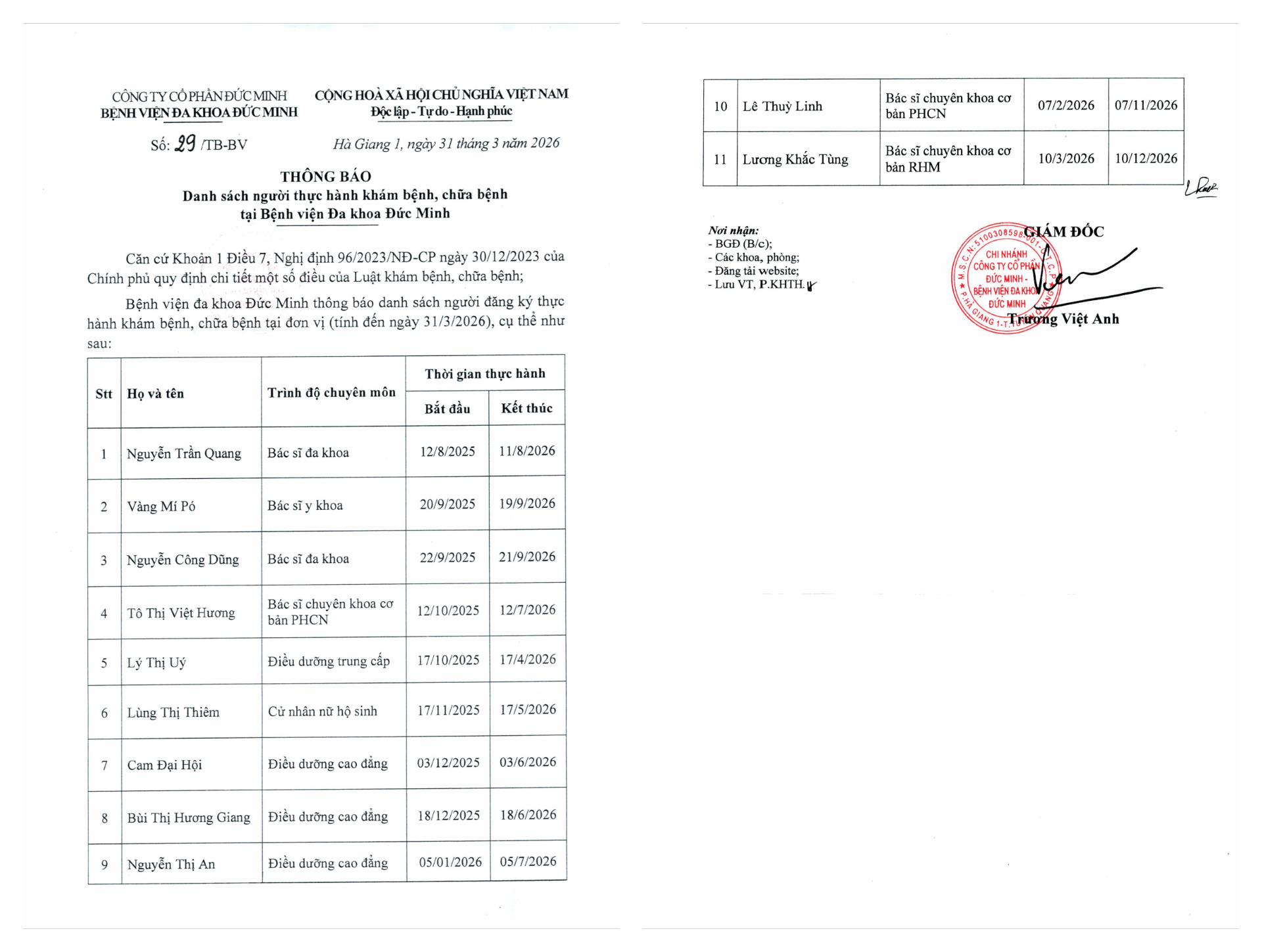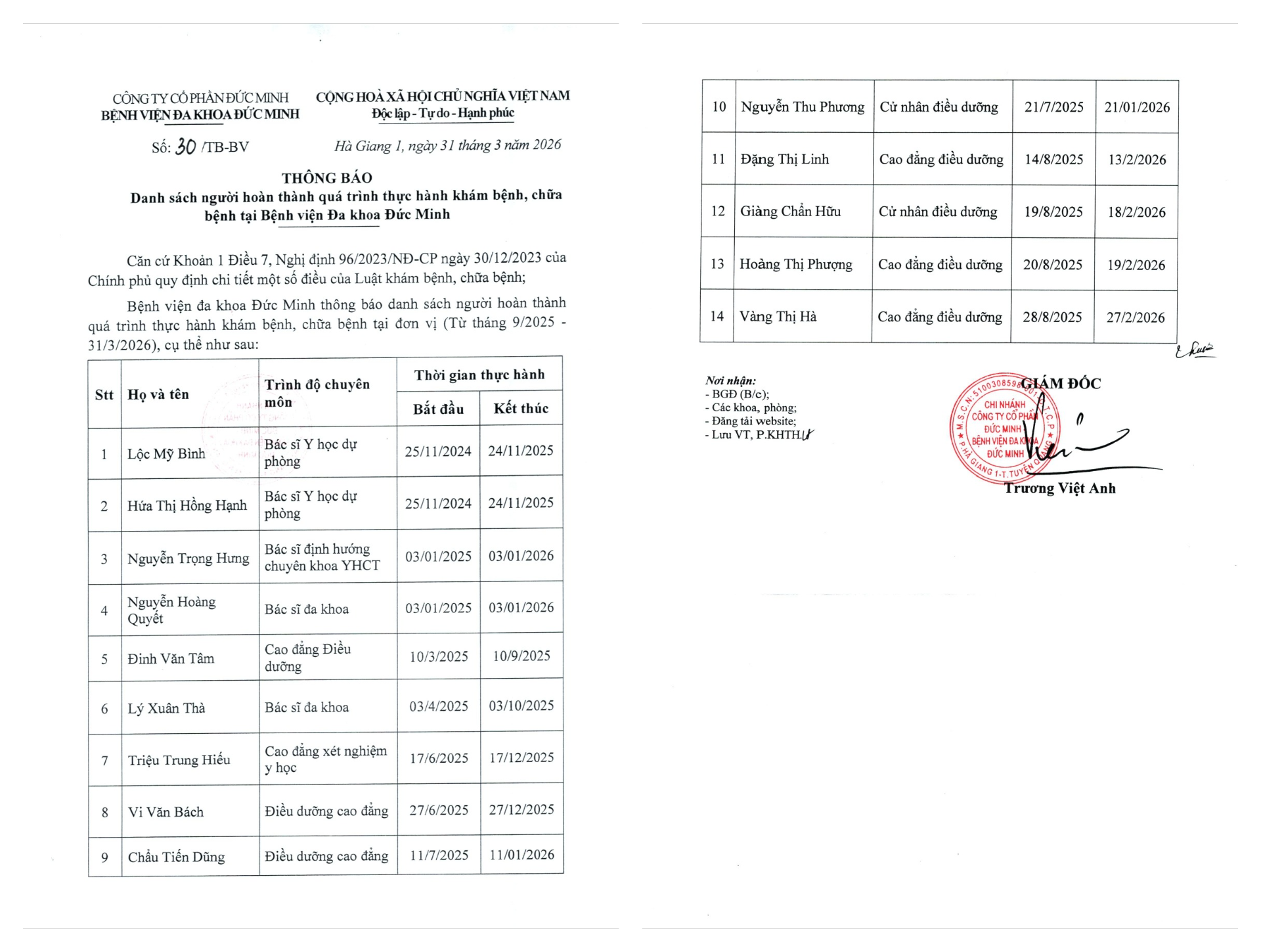 THÔNG BÁO DANH SÁCH NGƯỜI THỰC HÀNH KHÁM BỆNH, CHỮA . . .